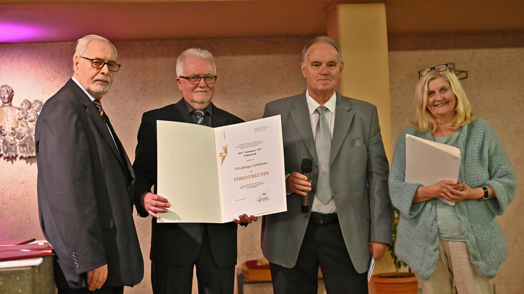 Ein weiterer Höhepunkt des Abends war die Ehrung langjähriger passiver Mitglieder für 25- bis 70-jährige Treue zum Chorverein. Zudem überreichten die Vertretungen beider Chorverbände die Jubiläumsurkunde zum 150-jährigen Bestehen. Mehrere Chormitglieder wurden für viele Jahre Chorsingen besonders ausgezeichnet.