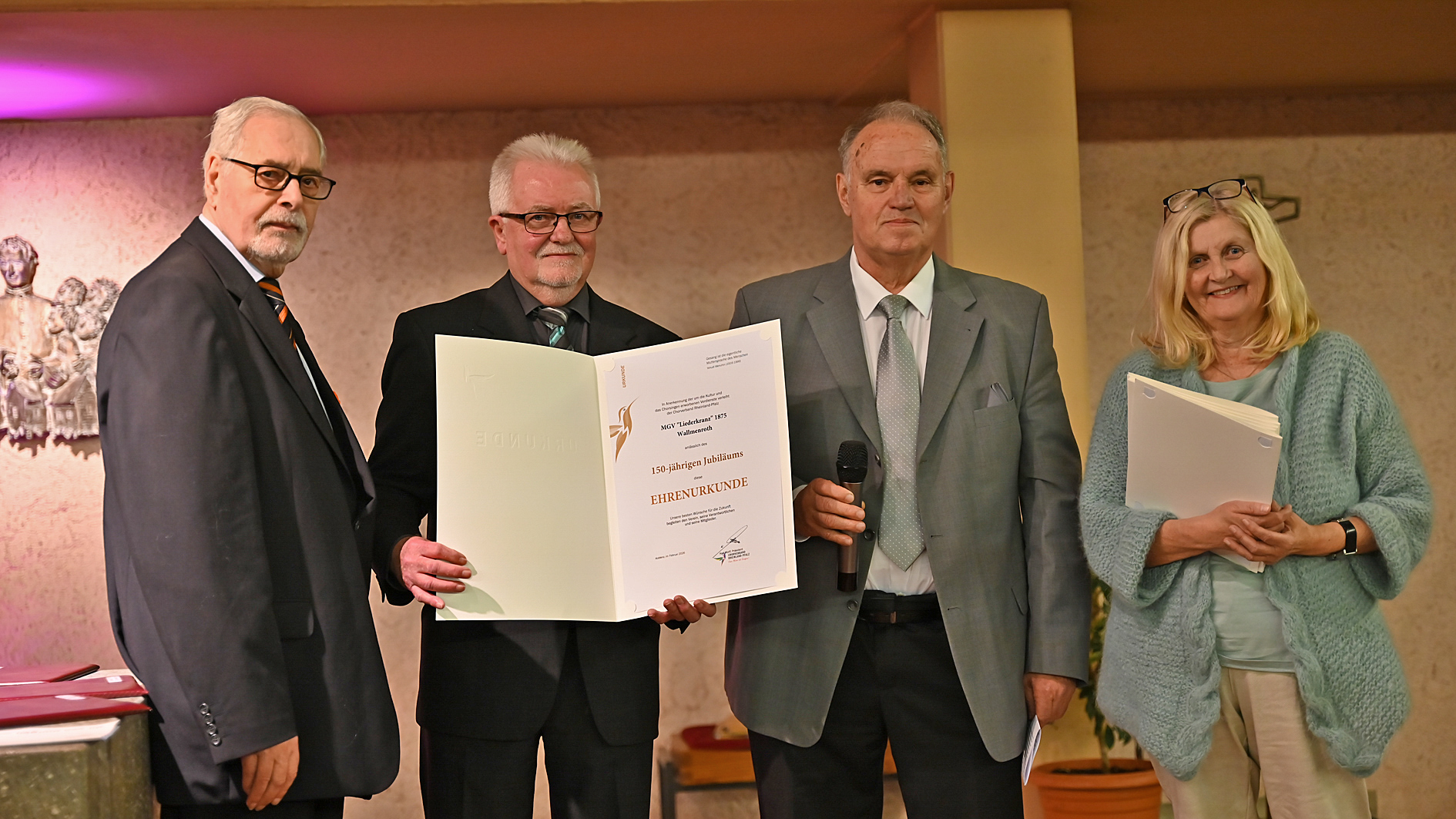 Der MGV Liederkranz Wallmenroth feierte am 28. Februar sein 150-jähriges Jubiläum mit einem festlichen Konzert in der Don-Bosco-Kirche. Zahlreiche Gäste waren gekommen, um den besonderen Abend mitzuerleben. Unter dem Leitmotiv ‚Hymne‘ eröffnete der Gastgeber mit dem Eröffnungsruf ‚Cum Canto‘ und setzte gleich zu Beginn einen klangvollen Akzent. Teamsprecher Jens Rolland begrüßte das Publikum und die Ehrengäste, darunter den Ehrenpräsidenten des Chorverbands Rheinland-Pfalz, Karl Wolff, Vertretungen aus dem Kreis-Chorverband Altenkirchen, der Kommunalpolitik, den Nachbargemeinden sowie den scheidenden Landtagsabgeordneten Michael Wäschenbach.
