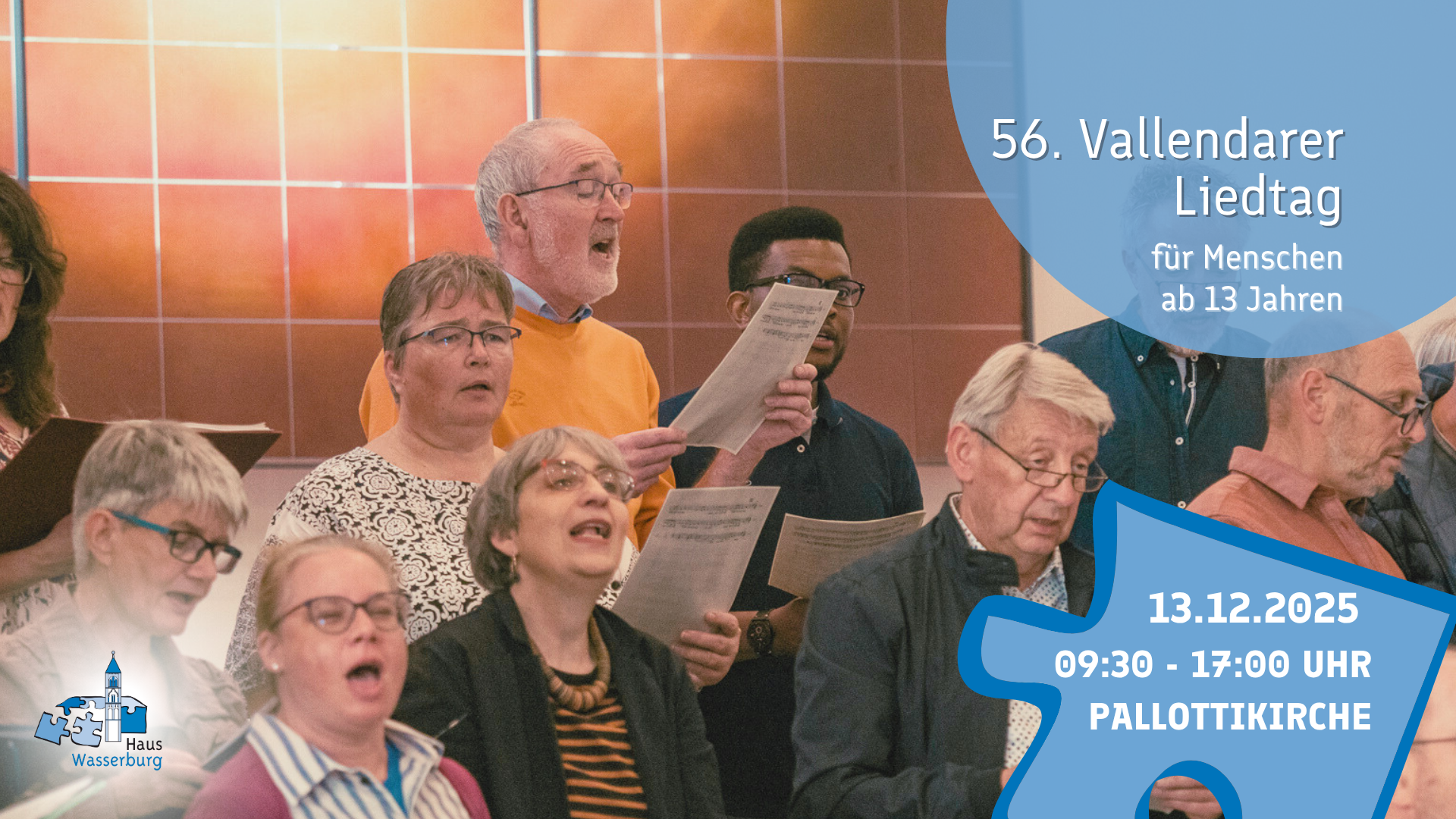 Der 56. Vallendarer Liedtag lädt am 13. Dezember Menschen ab 13 Jahren in die Pallottikirche nach Vallendar ein. Der Liedtag richtet sich an Mitwirkende von 13 bis 99 Jahre, die Freude am gemeinsamen, vor allem mehrstimmigen Singen haben oder diese entdecken möchten. Sowohl Personen ohne Chorerfahrung, musikalische ‚Singles‘, für die das Singen mit anderen eine neue Erfahrung bedeutet, sind willkommen, als auch geübte Chormitglieder, die bereits mit dem mehrstimmigen Singen in Gemeinschaft gut vertraut sind.