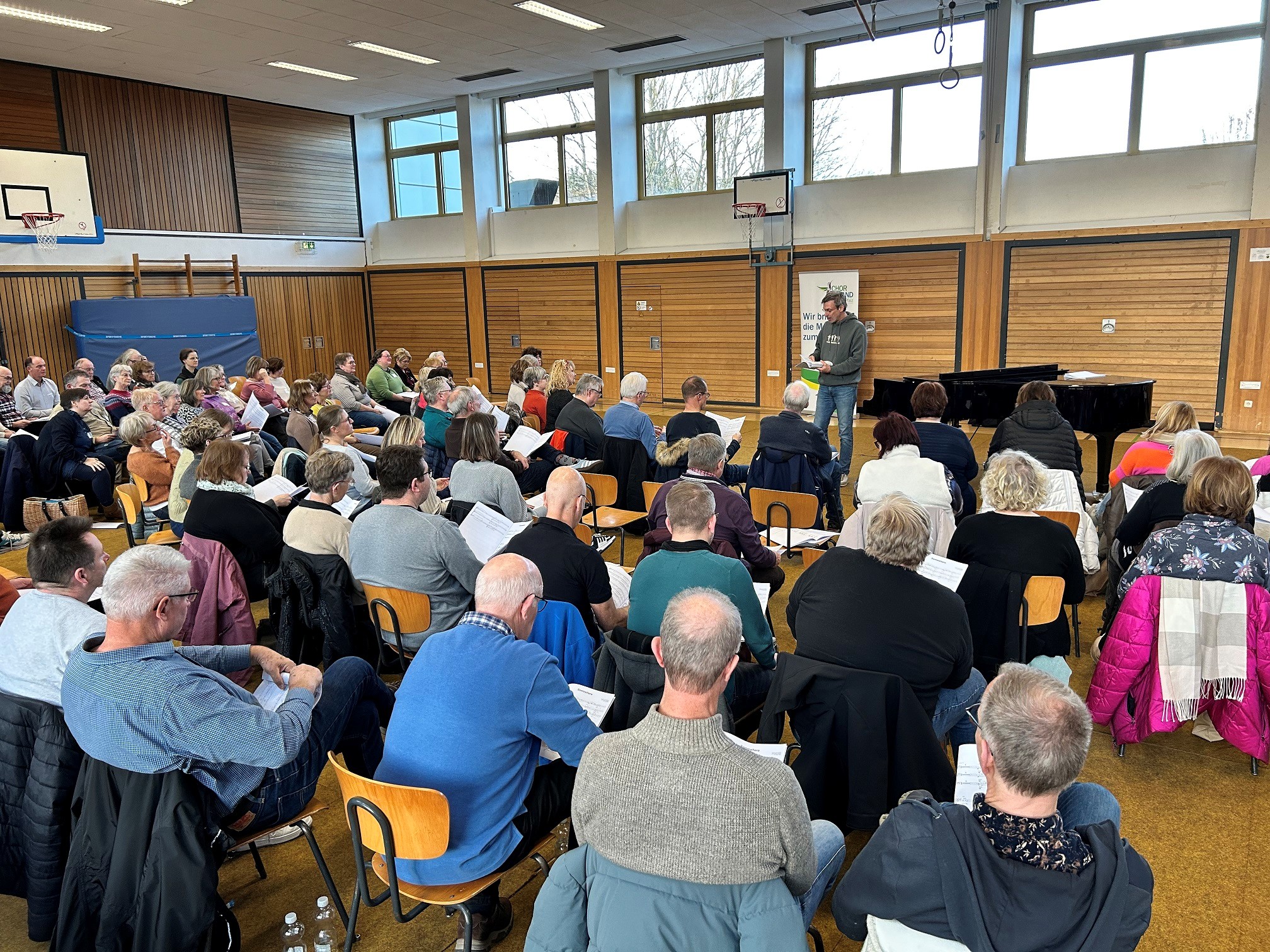 Am Vormittag arbeiteten zwei Projektchöre, rund 45 Männer und 90 Frauen, mit Meister und Rhein. Beide Dozenten brachten eine breite Auswahl an Chorliteratur mit, die von moderner Lautmalerei über traditionelle Abendlieder bis hin zu arrangierten Popsongs reichte. Die Spannweite reichte bei den Männern von Werken wie A. M. Schonens ‚Waiting for Wellermann‘, H. Rechbergers ‚Das alte Schloss‘, M. Neumanns ‚Geheimnis‘ und J. Mörths ‚Into the Valley of Death‘ bis zu U. Henkhaus ‚Grad aus dem Wirtshaus‘.
