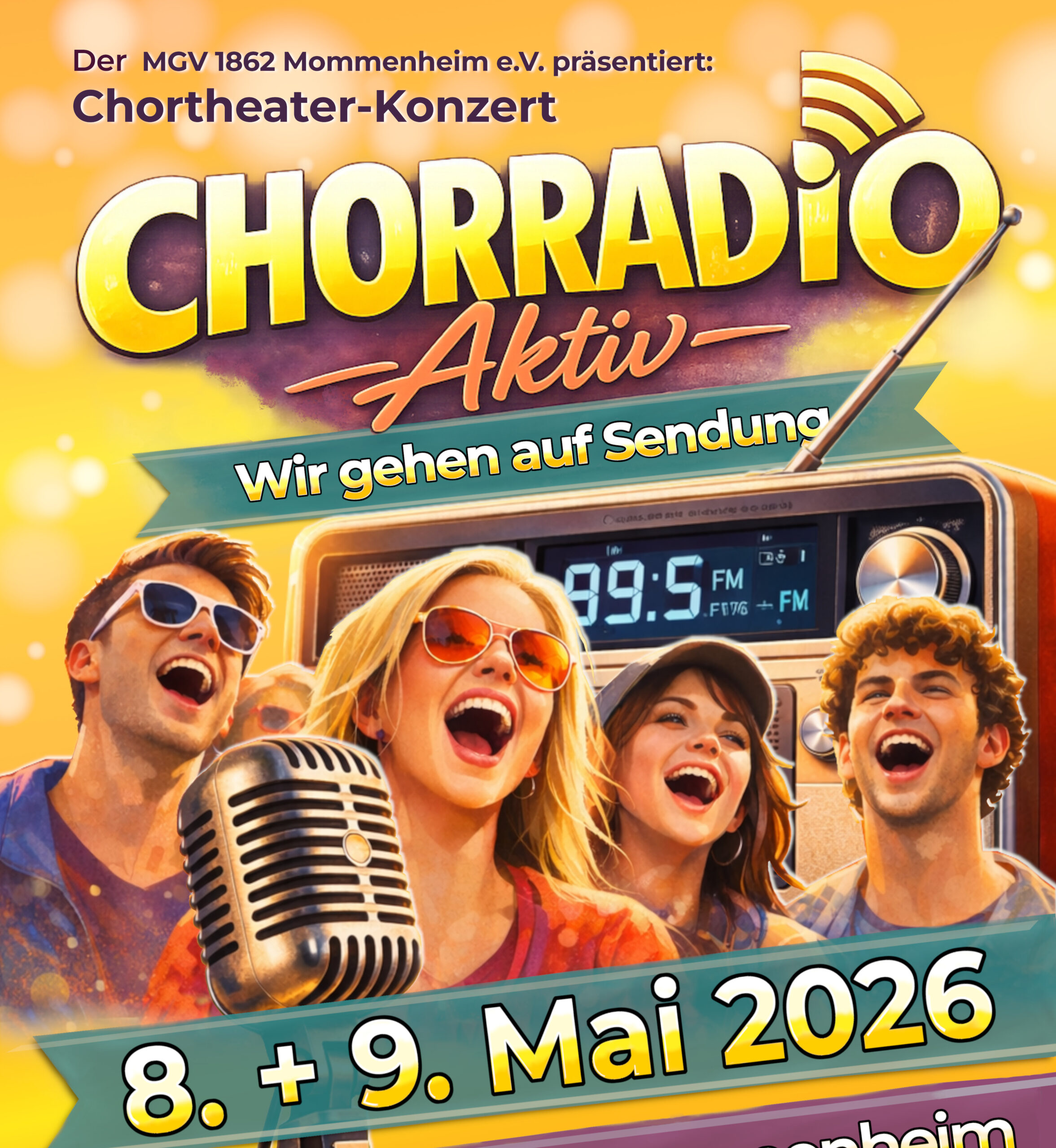 Am 8. und 9. Mai wird die Gemeindehalle Mommenheim zum Radiostudio. Unter dem Titel ‚Chorradio Aktiv – Wir gehen auf Sendung‘ lädt der MGV 1862 Mommenheim zu zwei Abenden ein, die Chorsingen mit szenischen Elementen verbinden und damit weit über das klassische Format eines Chorkonzertes hinausgehen. Der Chorverein dreht sinnbildlich am Frequenzregler und schaltet auf ‚Chortheater 2.0‘.