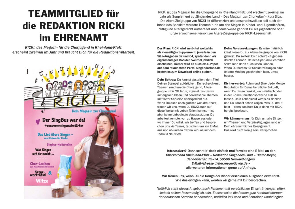 ‚Ricki‘ ist die junge Stimme für die Chorjugend in Rheinland-Pfalz. Gesucht wird eine Person für die ehrenamtliche Redaktion. Das Booklet erscheint zweimal im Jahr – bisher als vierseitiges Supplement innerhalb von ‚Singendes Land – Das Magazin zur Chorkultur‘ und soll später als eigenständiges Heft aufgelegt werden. Entsprechend lebendig und jugendlich soll auch der redaktionelle Inhalt bleiben. ‚Ricki‘ möchte Themen aus der Welt der Kinder- und Jugendchöre so erzählen, dass sie in der Lebenswirklichkeit junger Menschen bleiben: leicht, kreativ, aber dennoch fundiert.