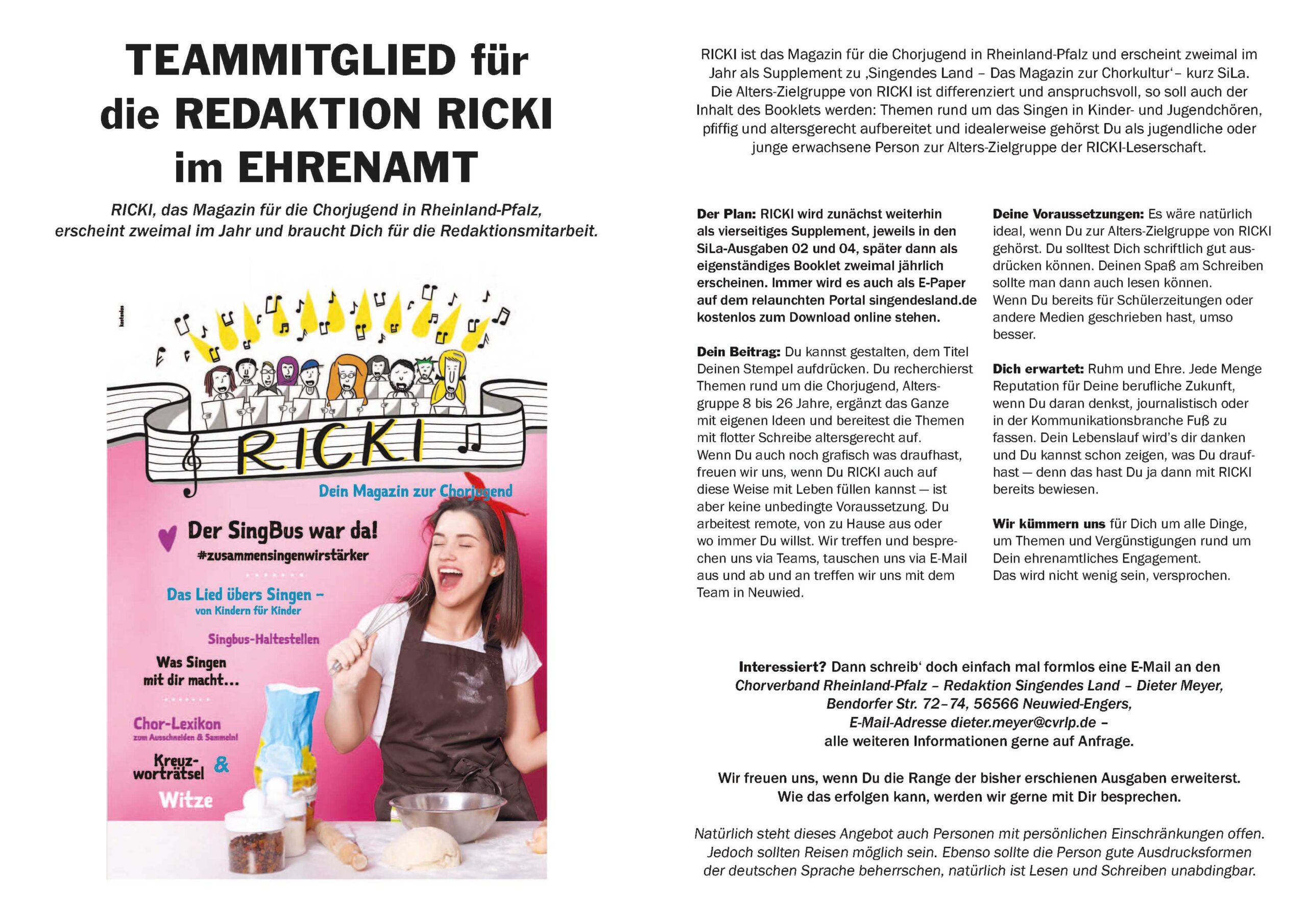 Der Chorverband Rheinland-Pfalz kümmert sich um alle Details rund um das ehrenamtliche Engagement – und das wird nicht wenig sein, versprochen. Alle weiteren Informationen zur ehrenamtlichen Mitarbeit im Ricki-Team auf Anfrage an redaktion@singendesland.de – Dieter Meyer. Bewerbungen bitte formlos ebenfalls an diese Adresse. Das Redaktionsteam freut sich auf eine Person, die ‚Ricki‘ perspektivisch mit frischen Ideen bereichert.