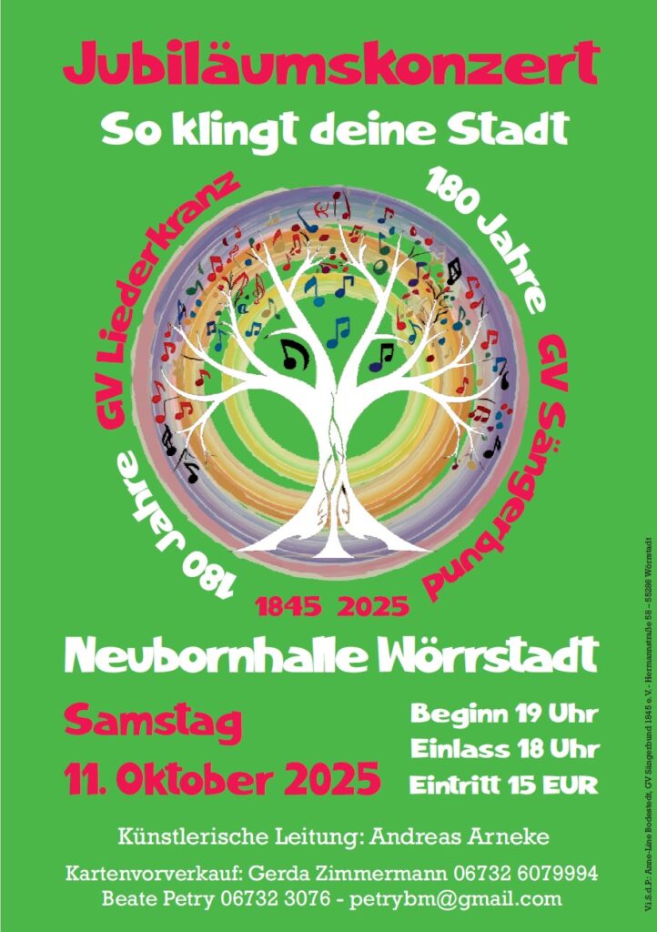 Die beiden traditionsreichen Wörrstädter Chorvereine – der GV Sängerbund 1845 und der GV Liederkranz 1845 – feiern in diesem Jahr ihr 180-jähriges Bestehen. Zum gemeinsamen Jubiläumskonzert mit dem Titel ‚So klingt deine Stadt‘ laden die Chorvereine und ihre Chöre am 11. Oktober um 19 Uhr in die Neubornhalle Wörrstadt ein.