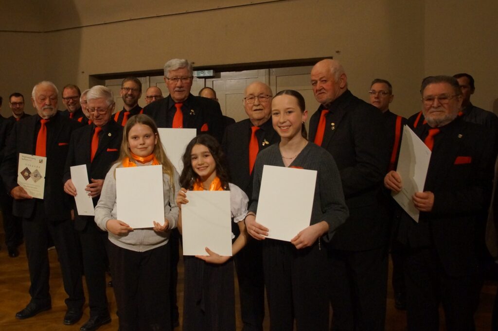 Für fünf Jahre Chorsingen erhielten die Jungkehlchen Emilia Charlet, Marieke Schröder und Valentina Weber eine Urkunde. In diesem Zusammenhang wurde auch die Arbeit der Nachwuchschöre DieKehlchen hervorgehoben, die kontinuierlich junge Menschen an das Singen im Chor heranführen. Heinz-Willi Dechent wurde für 25 Jahre Chorsingen mit der Ehrennadel in Bronze ausgezeichnet. Die goldene Ehrennadel für 50 Jahre Sängerleidenschaft erhielt Gerd Schlüter, der sich auch zeitweise ehrenamtlich im Vorstand des Chorvereins engagierte.