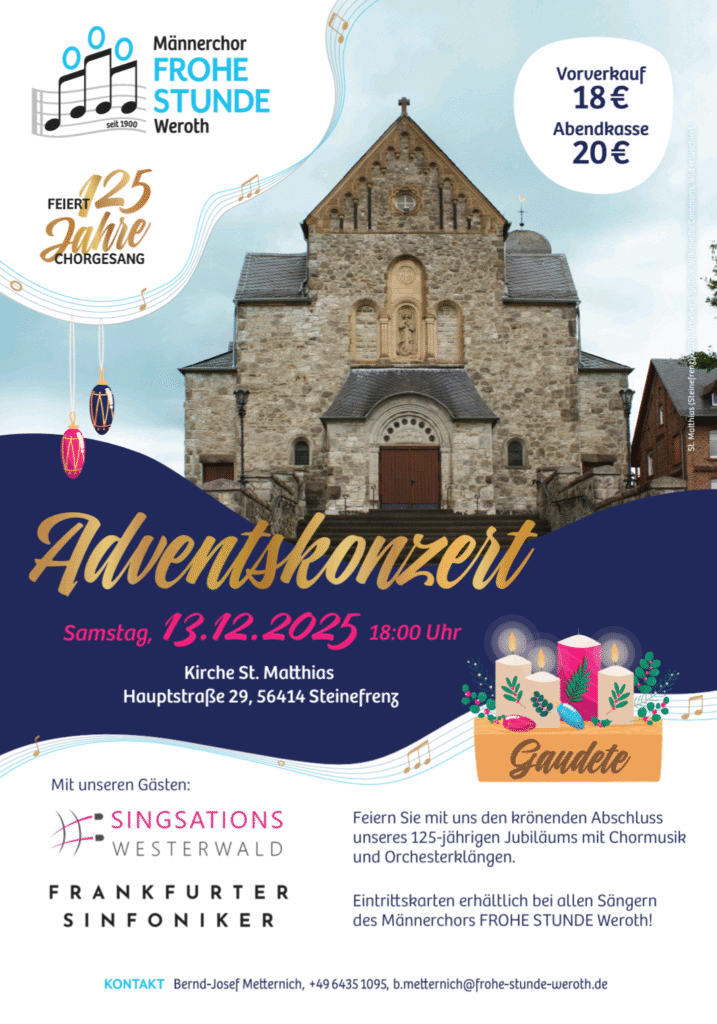Mit der Aufforderung ‚Gaudete – Freuet Euch‘, die in Vorfreude auf Weihnachten den dritten Advent einleitet, lädt der Männerchor Frohe Stunde Weroth am 13. Dezember zu einem Adventskonzert in die Kirche St. Matthias in Steinefrenz ein. Beginn ist um 18:00 Uhr, Einlass ab 17:30 Uhr. Das Konzert bildet den musikalischen Höhepunkt und zugleich den krönenden Abschluss des Jahres im 125-jährigen Chorjubiläum.