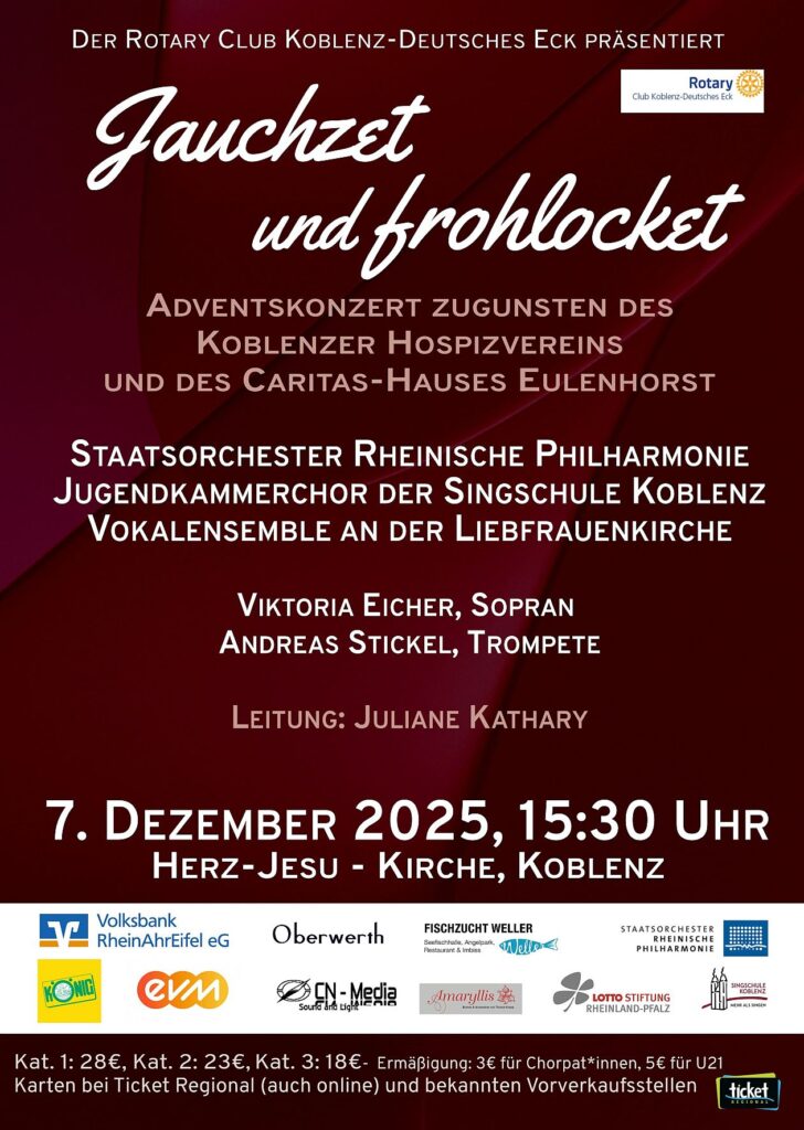 Am 7. Dezember, findet um 15.30 Uhr zum mittlerweile 22. Mal das Benefizkonzert ‚Jauchzet und frohlocket‘ statt, in diesem Jahr in der Herz-Jesu-Kirche in Koblenz. Die musikalische Leitung hat erneut Regionalkantorin Juliane Kathary. Mitwirkende sind der Jugendkammerchor der Singschule Koblenz, das Vokalensemble an der Liebfrauenkirche und das Staatsorchester Rheinische Philharmonie. Solistisch wirkt Andreas Stickel auf der Trompete mit, es singt die Sopranistin Viktoria Eicher. Das Programm bietet Werke von Johann Sebastian Bach, Georg Friedrich Händel, Johann Baptist Georg Neruda und Francis Poulenc.