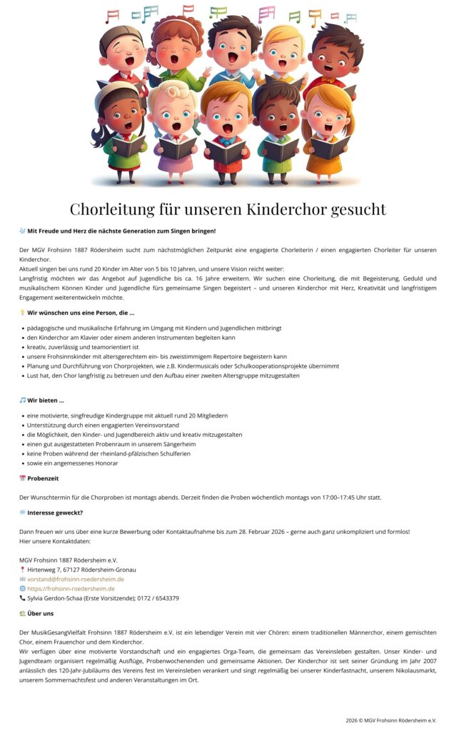 Der Chorverein freut sich über Bewerbungen von kreativen, zuverlässigen und teamorientierten Personen, die Interesse an der chormusikalischen Arbeit mit Kindern haben und das Chorsingen altersgerecht, engagiert und mit Freude gestalten. Informationen gibt es telefonisch bei Sylvia Schaa unter 0172 6543379 oder via E-Mail an vorstand@frohsinn-roedersheim.de