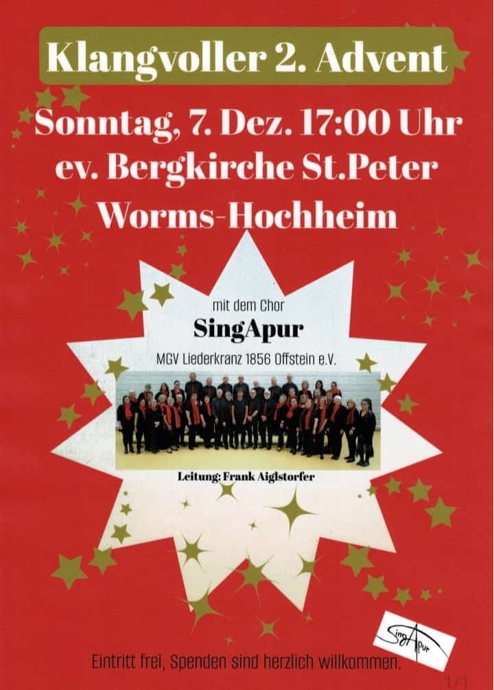 In der evangelischen Bergkirche Worms-Hochheim bot der Chor SingApur des MGV Liederkranz 1856 Offstein ein Chorkonzert zum zweiten Advent, das die voll besetzten Kirchenreihen rasch in festliche Stimmung versetzte. Die Nachfrage war so groß, dass zusätzliche Plätze vorbereitet werden mussten.