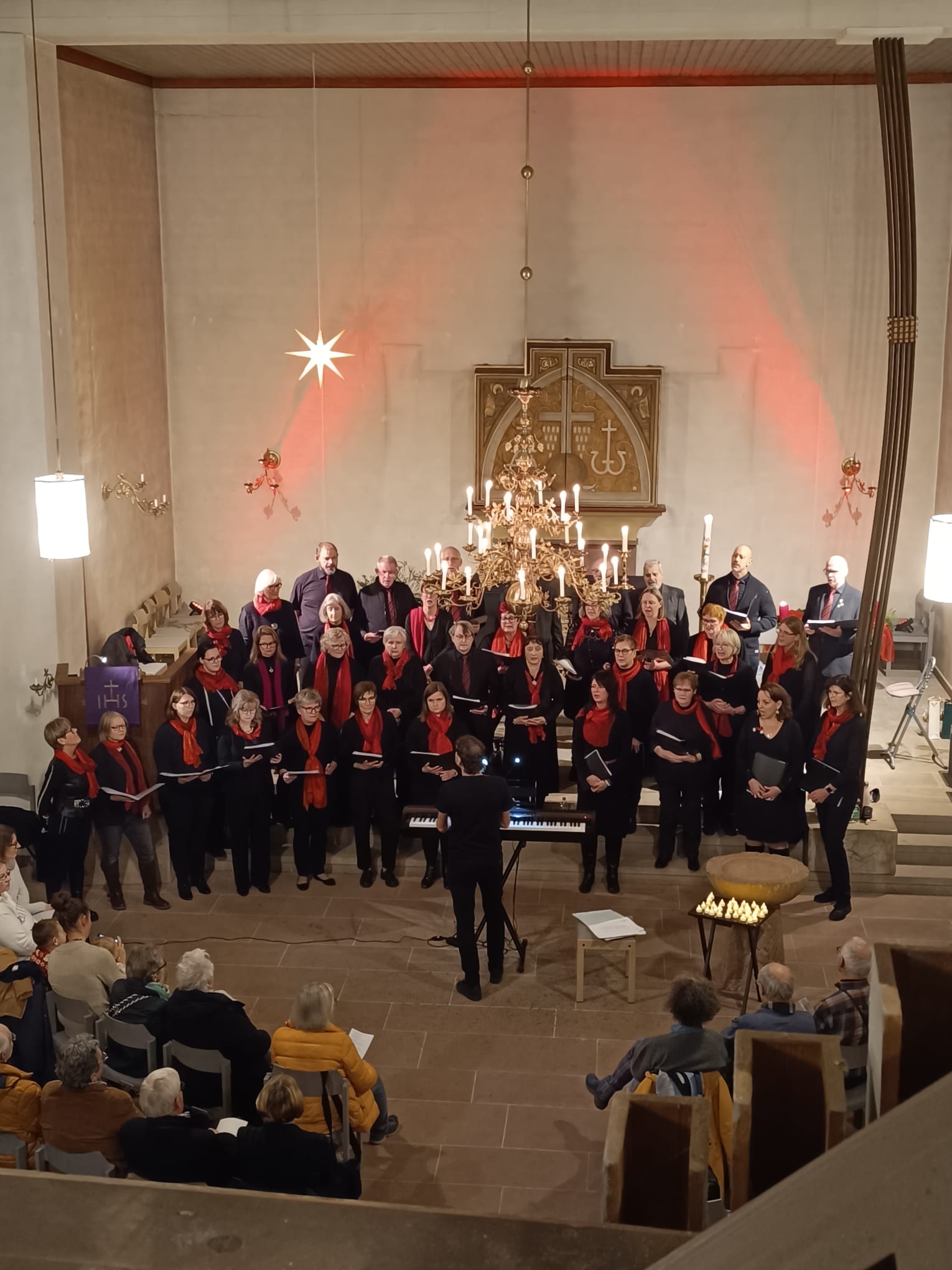 Zum Abschluss sangen Chor und Gäste gemeinsam ‚O du fröhliche‘, ehe ein Gospel diesen gelungenen Konzertabend abrundete und die Atmosphäre des zweiten Advents ausklingen ließ. Dank geht auch an die evangelische Bergkirche Worms-Hochheim, die ihre Räume und die Kirche für das Chorkonzert zur Verfügung stellte.