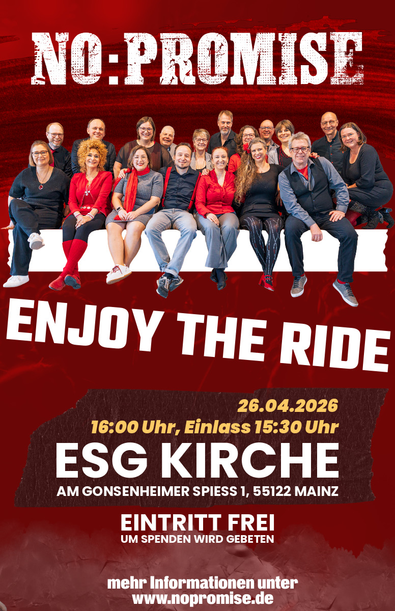 Unter dem Titel ‚Enjoy the Ride‘ präsentiert das Mainzer Vokalensemble No:Promise am 26. April ein Chorkonzert in der Kirche der evangelischen Studierendengemeinde in Mainz. Auf dem Programm stehen Rock- und Popsongs der vergangenen Jahrzehnte, A-Capella arrangiert für vier- bis sechs Stimmen.