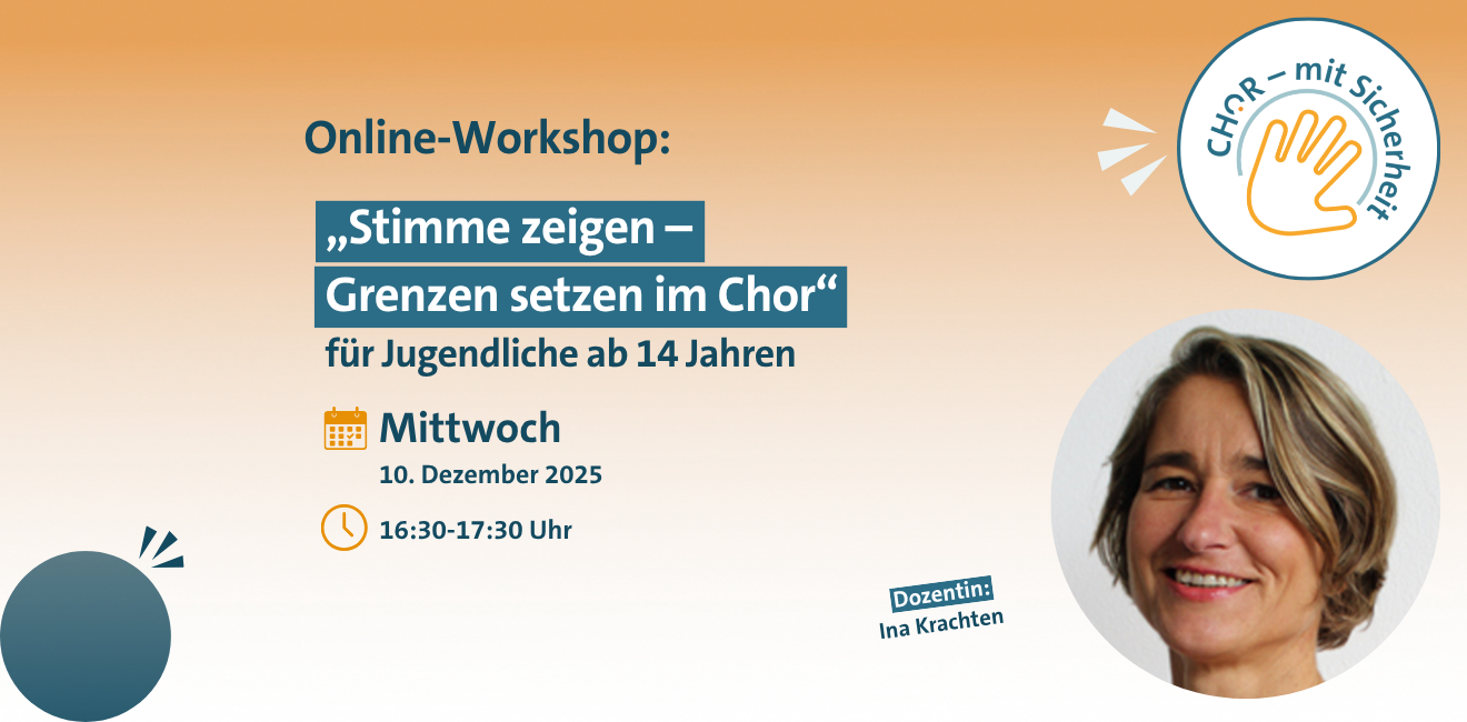 Im Online-Workshop am 10. Dezember geht es darum, wie Jugendliche im Chor ihre eigene Stimme sowohl musikalisch als auch persönlich stärken können. Gemeinsam wird erarbeitet, was es bedeutet, Grenzen zu setzen – in Proben, bei Auftritten und im sozialen Miteinander der Gruppe.
