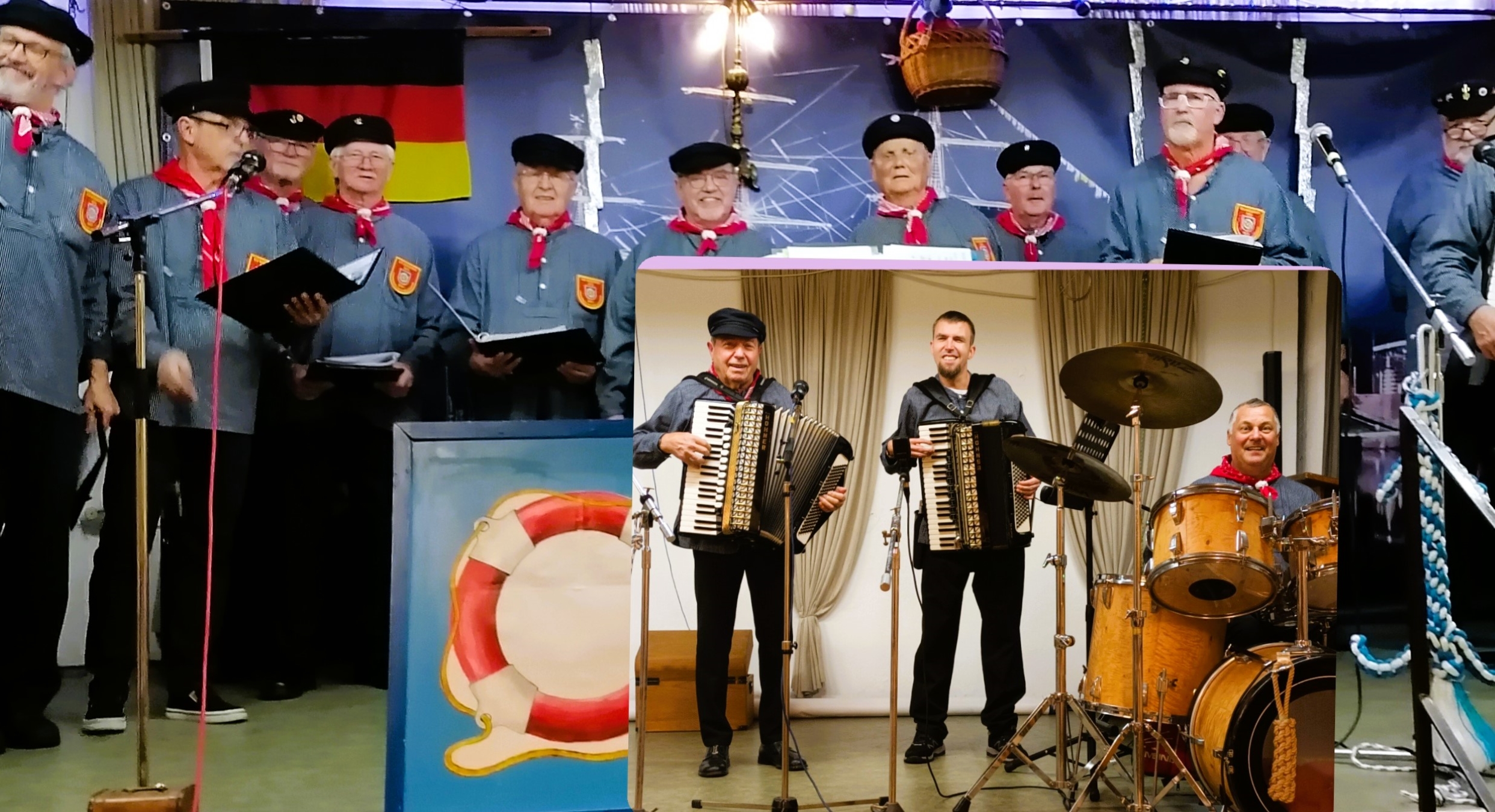 Moderator und Solist Dietrich Zimmer führte gemeinsam mit Rudi Schneele unterhaltsam durch das Programm. Beide würzten den Abend mit Anekdoten und augenzwinkerndem Seemannsgarn. Instrumental begleitet wurden die Seebären von Willi März auf der Mundharmonika, Alfred Hammerstein und Benedikt Schimmel auf dem Akkordeon sowie Helmut Schneider am Schlagzeug.