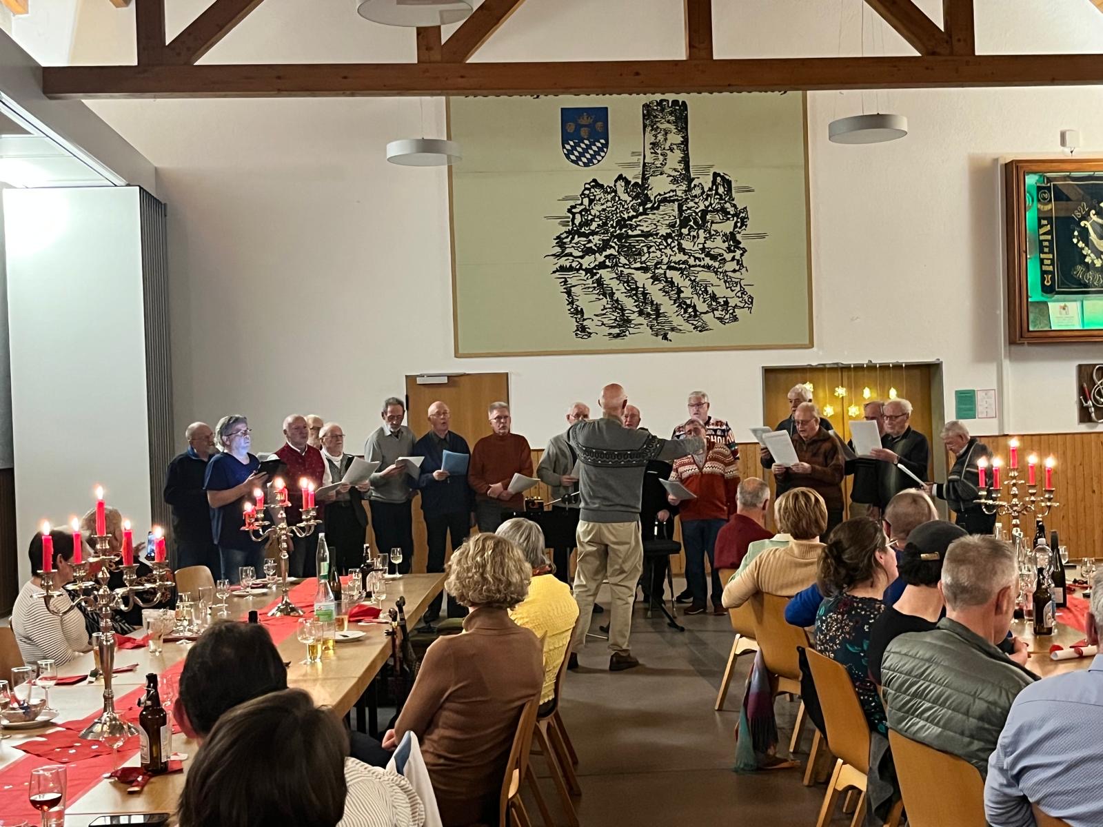 Für das leibliche Wohl sorgte ein reichhaltiges Buffet, das von vielen helfenden Händen vorbereitet wurde. Spiele und weihnachtliche Lieder der beiden Chöre prägten den weiteren Verlauf des Abends. Thomas Staßen dankte den Helfenden für den Aufbau und die stimmungsvolle Gestaltung der Halle, Oliver Heidrich für Glühwein, Punsch und Suppe, Joachim Böhler für die Spiele sowie allen, die Desserts beigesteuert hatten. Die Feier klang in ruhiger, gemeinschaftlicher Atmosphäre aus und stimmte die Anwesenden auf die Adventszeit ein. Der MGV Oberdiebach wünscht allen Mitgliedern und Freunden ein frohes und besinnliches Weihnachtsfest.