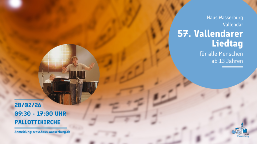 Alle, die Freude am Singen haben oder diese neu entdecken möchten, sind beim 57. Vallendarer Liedtag in Haus Wasserburg in Vallendar angesprochen. Der Workshop ist am 28. Februar in der Pallottikirche zu Vallendar und richtet sich an Menschen ab 13 Jahren. Start ist um 9:30 Uhr. Im Mittelpunkt steht das Singen in Gemeinschaft, insbesondere das Erarbeiten mehrstimmiger Lieder sowie das inhaltliche Auseinandersetzen mit den Liedtexten.